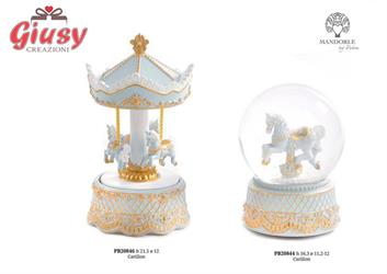 Carillon Giostrina Con Cavalli In Resina Color Celeste Con Dettagli Oro H.21,5 Cm 2*8