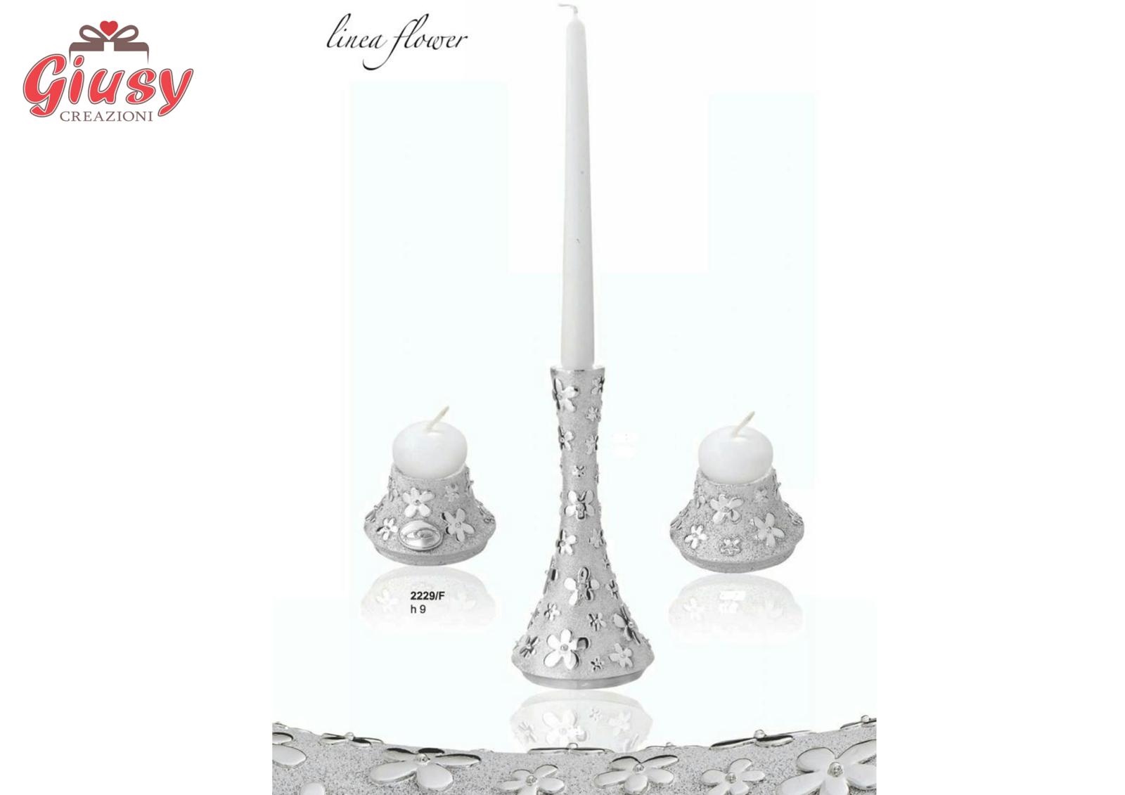 Portacandela Fiore Piccolo In Resina Bagno Argento Decoro Flower Diametro 12 Completo Di Scatola