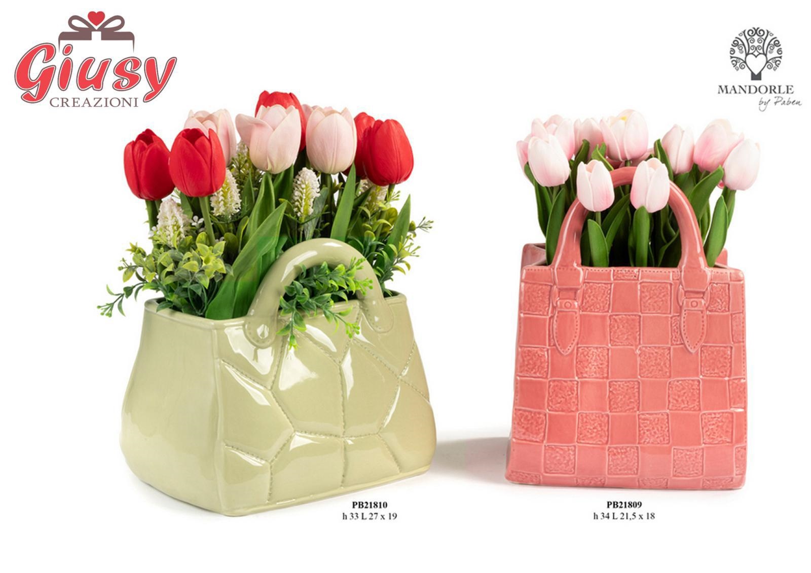 Vaso Di Tulipani A Forma Di Borsetta Verde 33 CM. Ceramica In Plastica 1*2