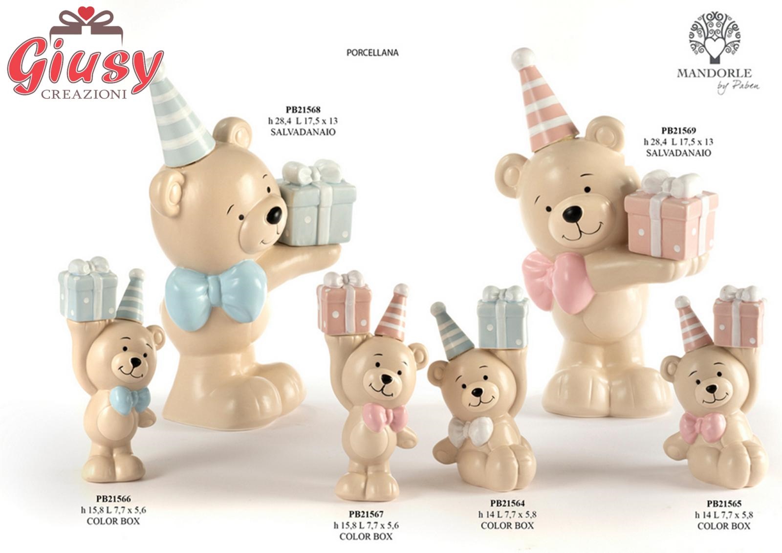 Salvadanio Orsetto Con Pacco E Csppello Celeste In Porcellana 1*4