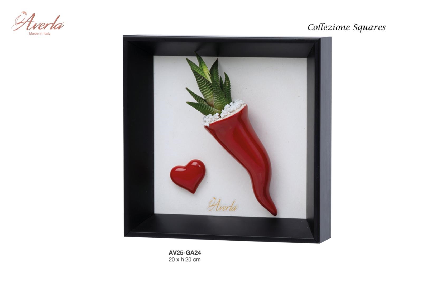 Quadretto In Legno Nero Con Corno Rosso In Ceramica Di Capodimonte E Piantina, 20X20 Cm Completo Di Scatola