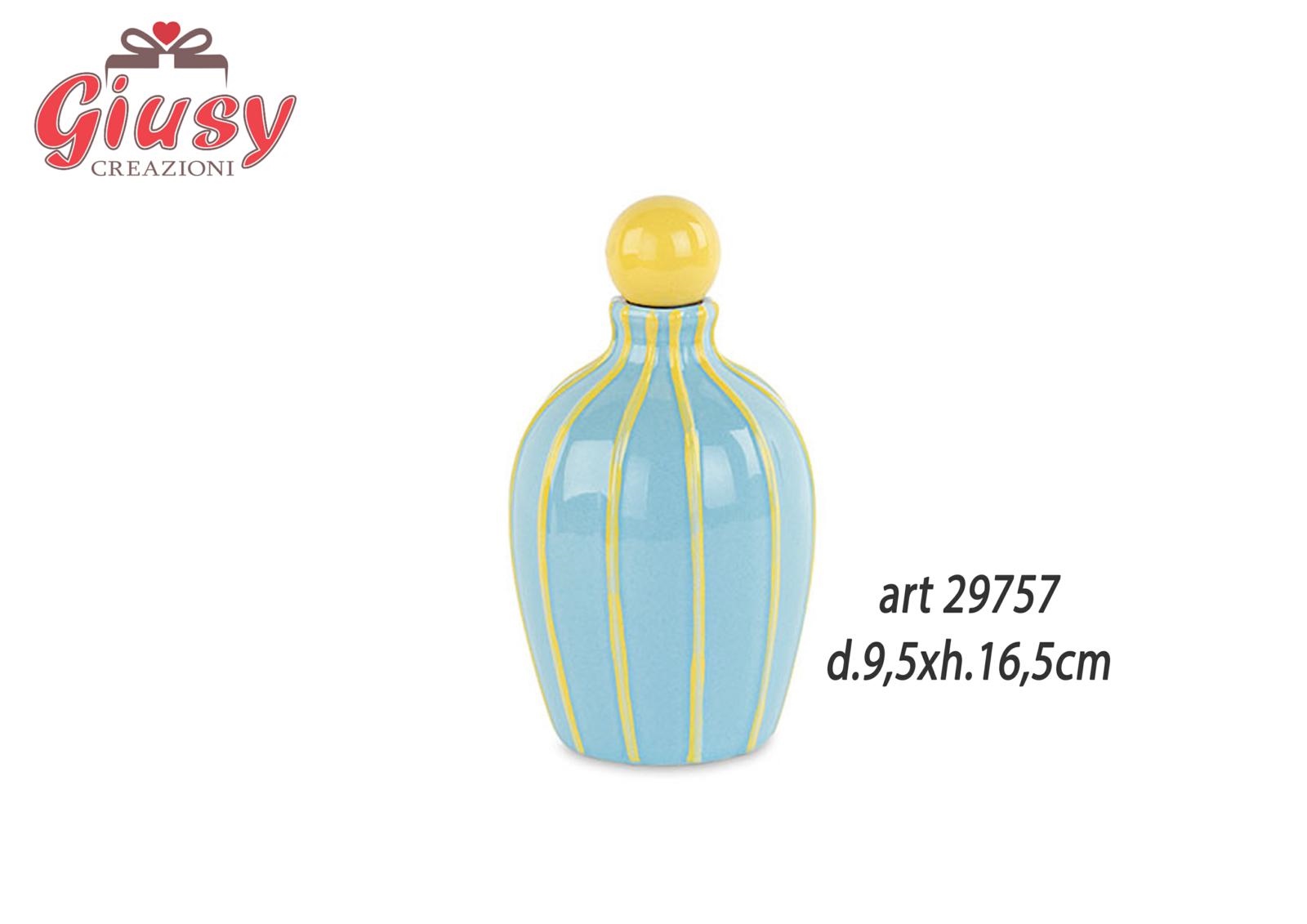 Oliera In Porcellana Color Celeste Con Tappo E Righe Color Giallo d.9,5xH.16,5 Cm Completa Di Scatola 1*72