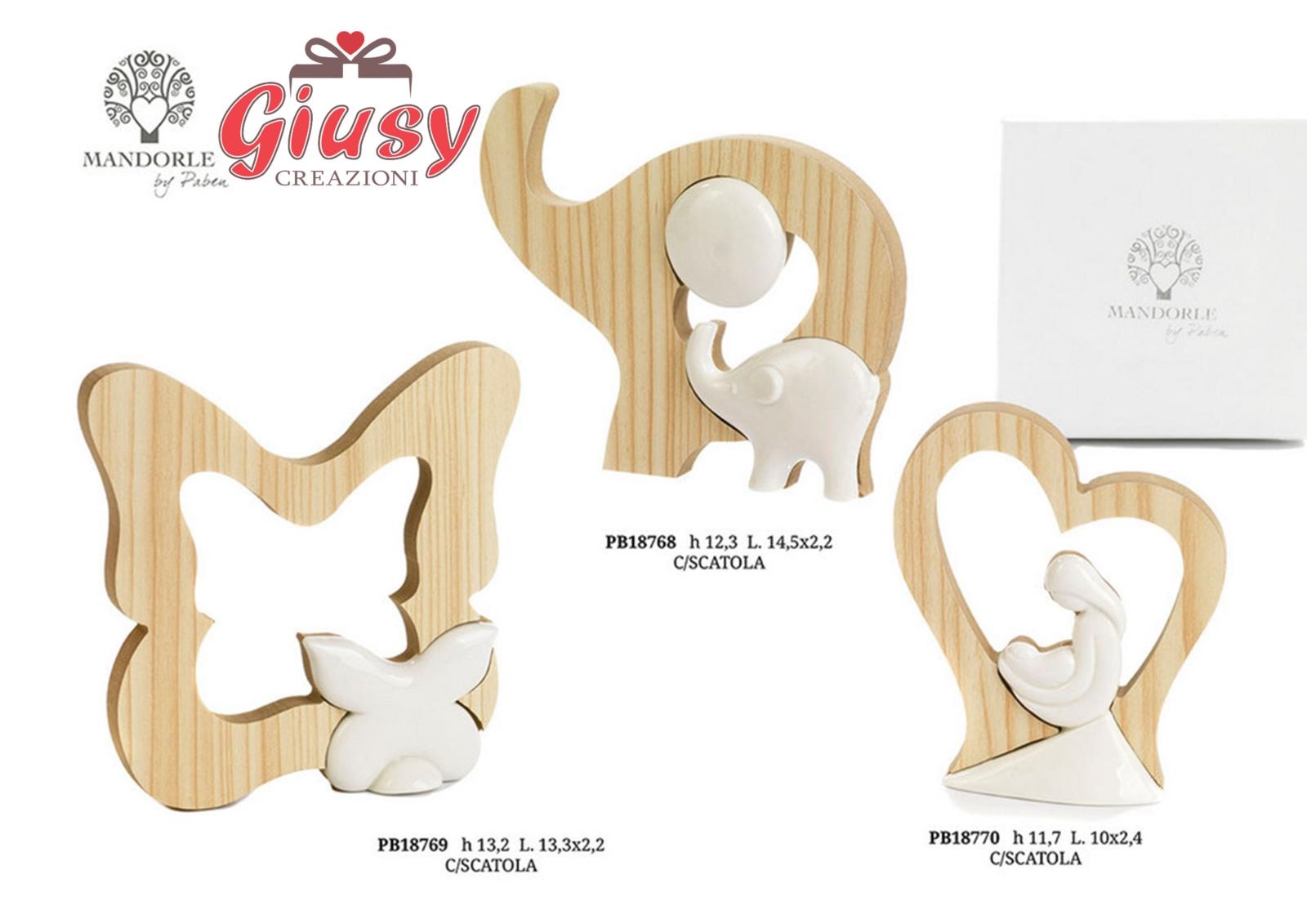 Coppia Elefanti Stilizzati In Legno E Porcellana h.12,3 Cm Completa Di Scatola 3*48