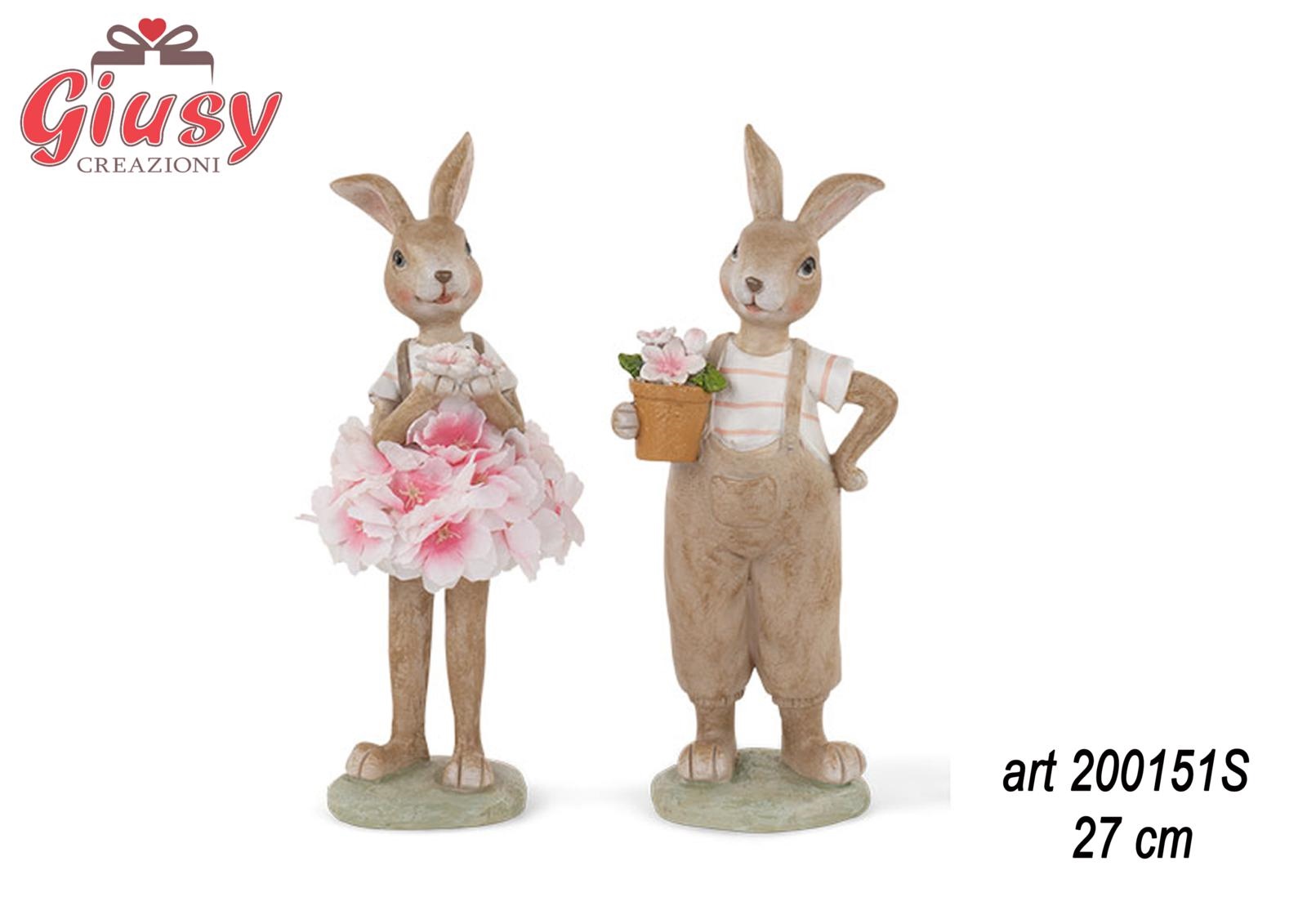 Coniglietti In Piedi Con Fiori Due Assortiti In Poliresina H 27 Cm 4*16