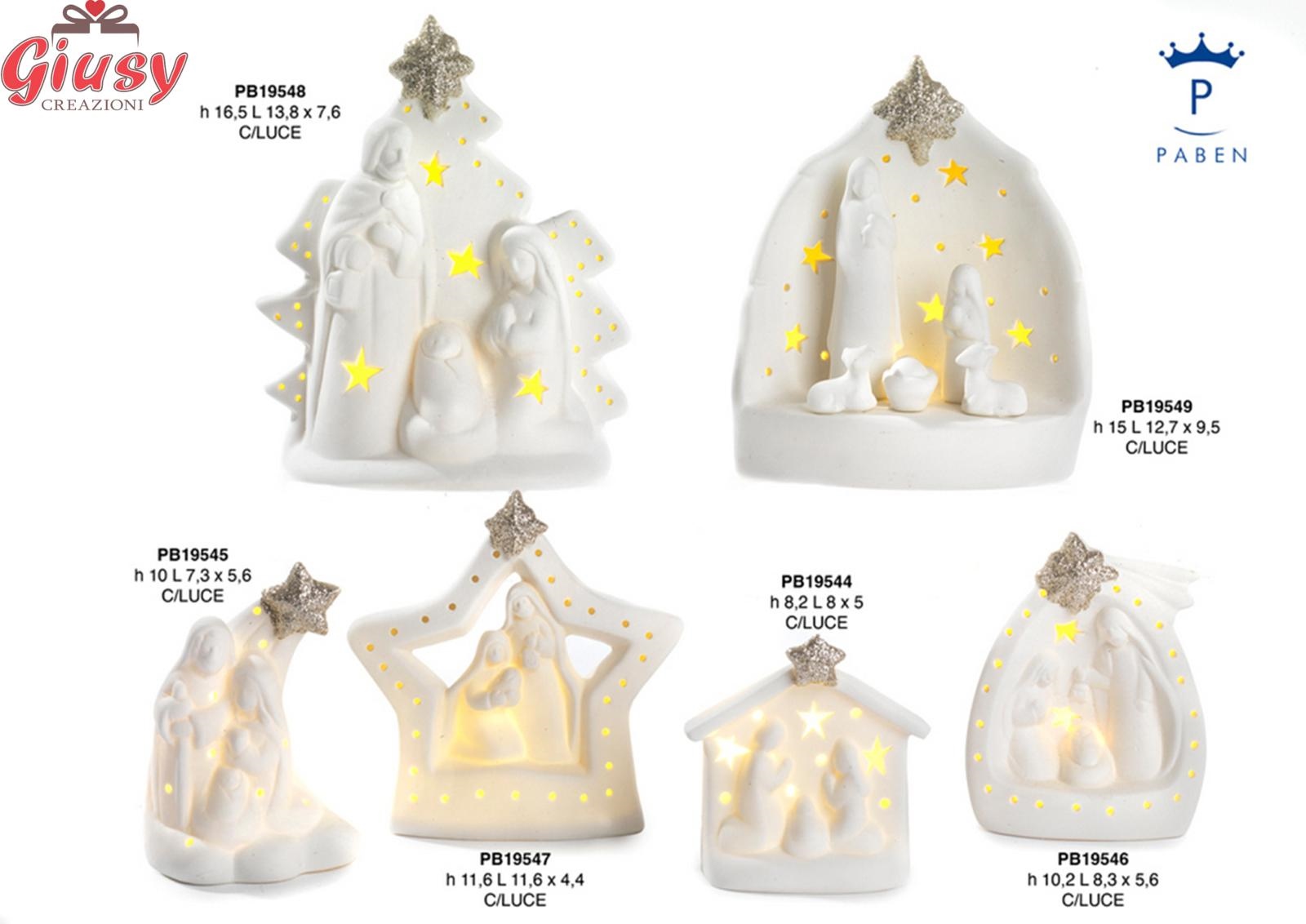 Gruppo Natività Bue E Asino Stilizzato In Grotta In Porcellana 15 Cm con Led
