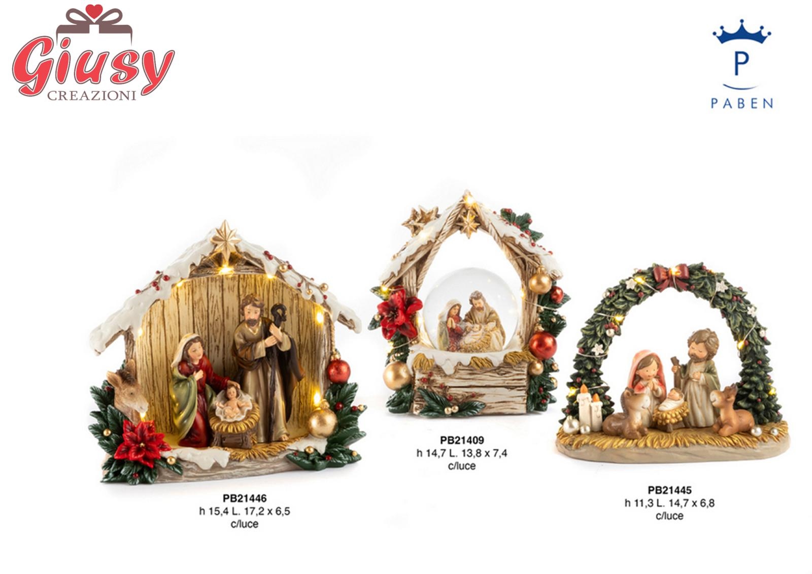 Capanna Con Globo Gruppo Natività 14.7 Cm. Resina a Vetro Luci