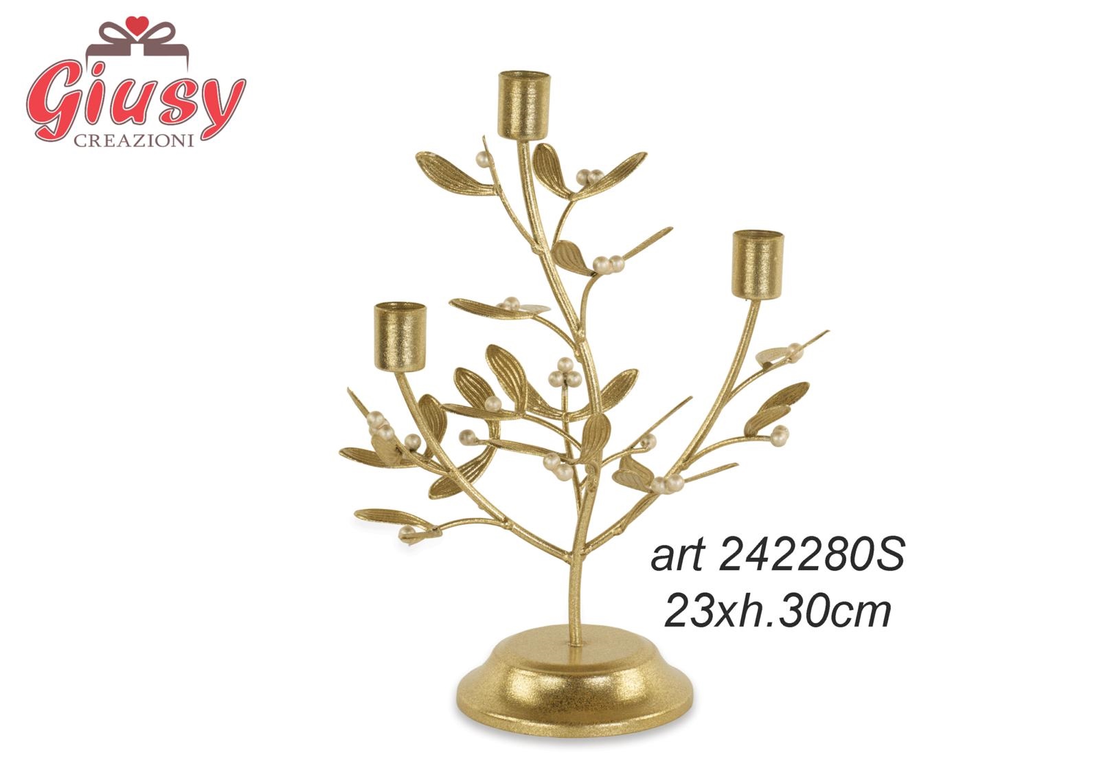 Porta 3 Candele Vischio In Metallo Color Oro 23xH.30 Cm 1*12