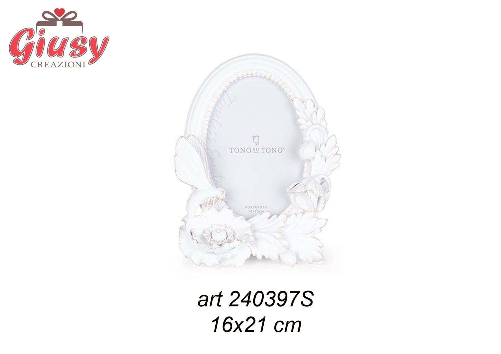 Portafoto Ovale Con Fiori Bianco E Oro 16X21 Cm In Poliresina