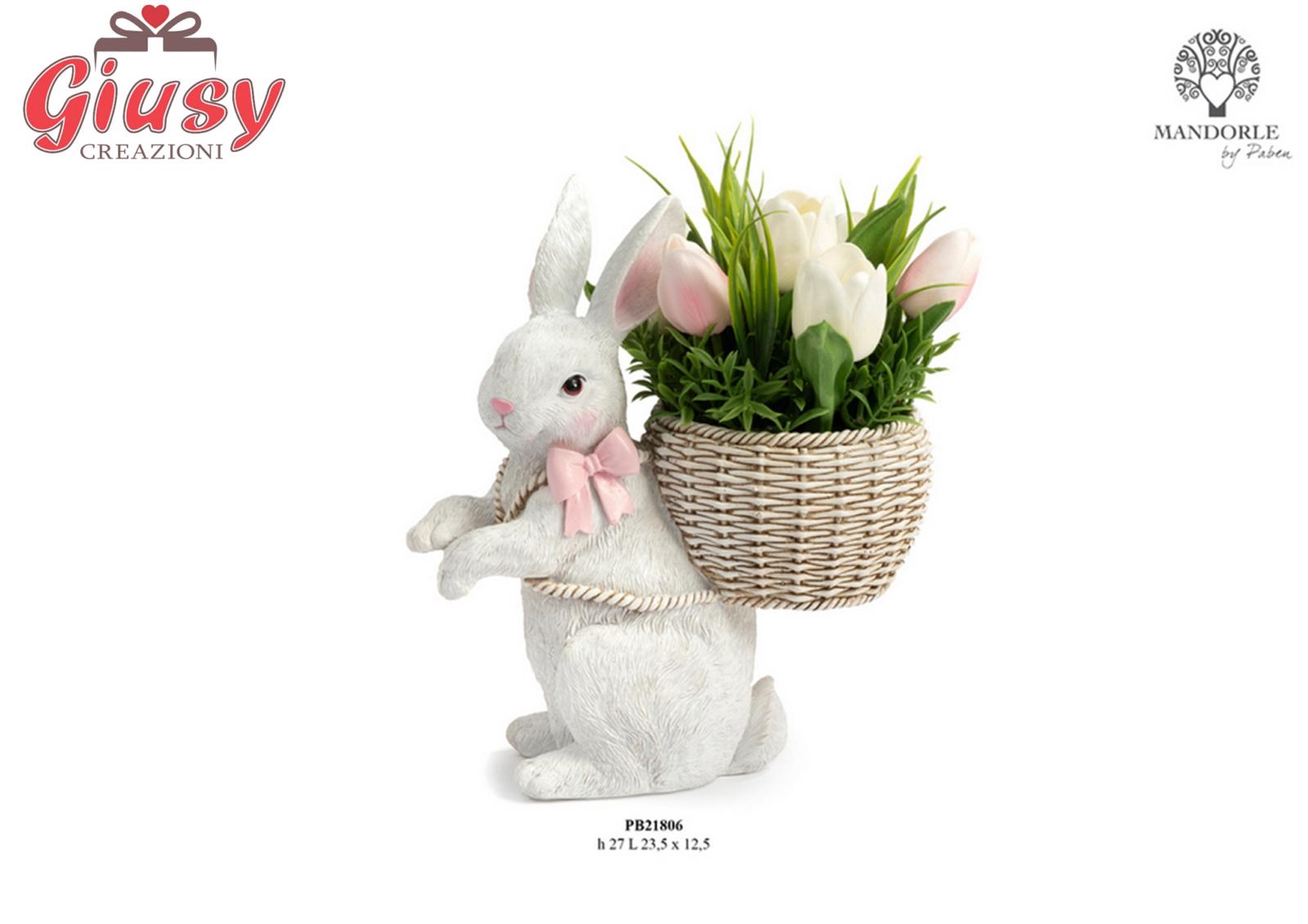 Coniglio Con Cesta Di Tulipani In Resina E Plastica, h 27 Cm 1*4