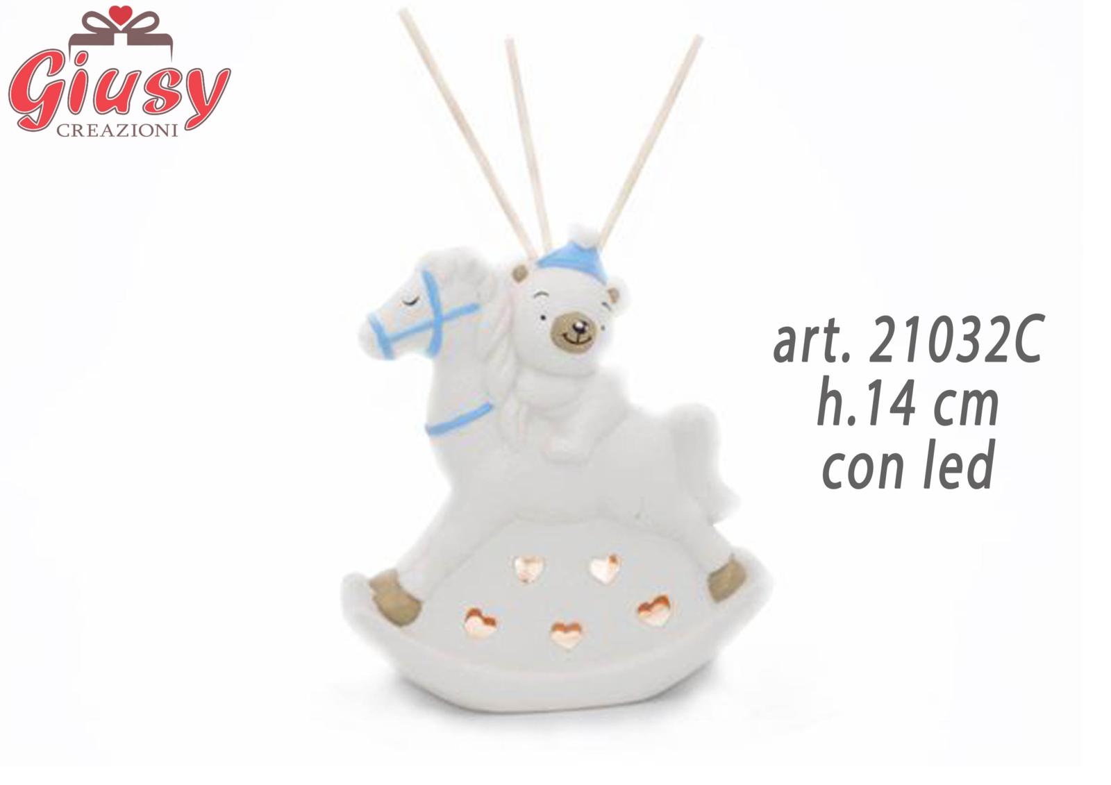 Cavallo A Dondolo In Ceramica Con Orsetto Celeste Con Luce Led 13x5xh.14 Cm 2*36