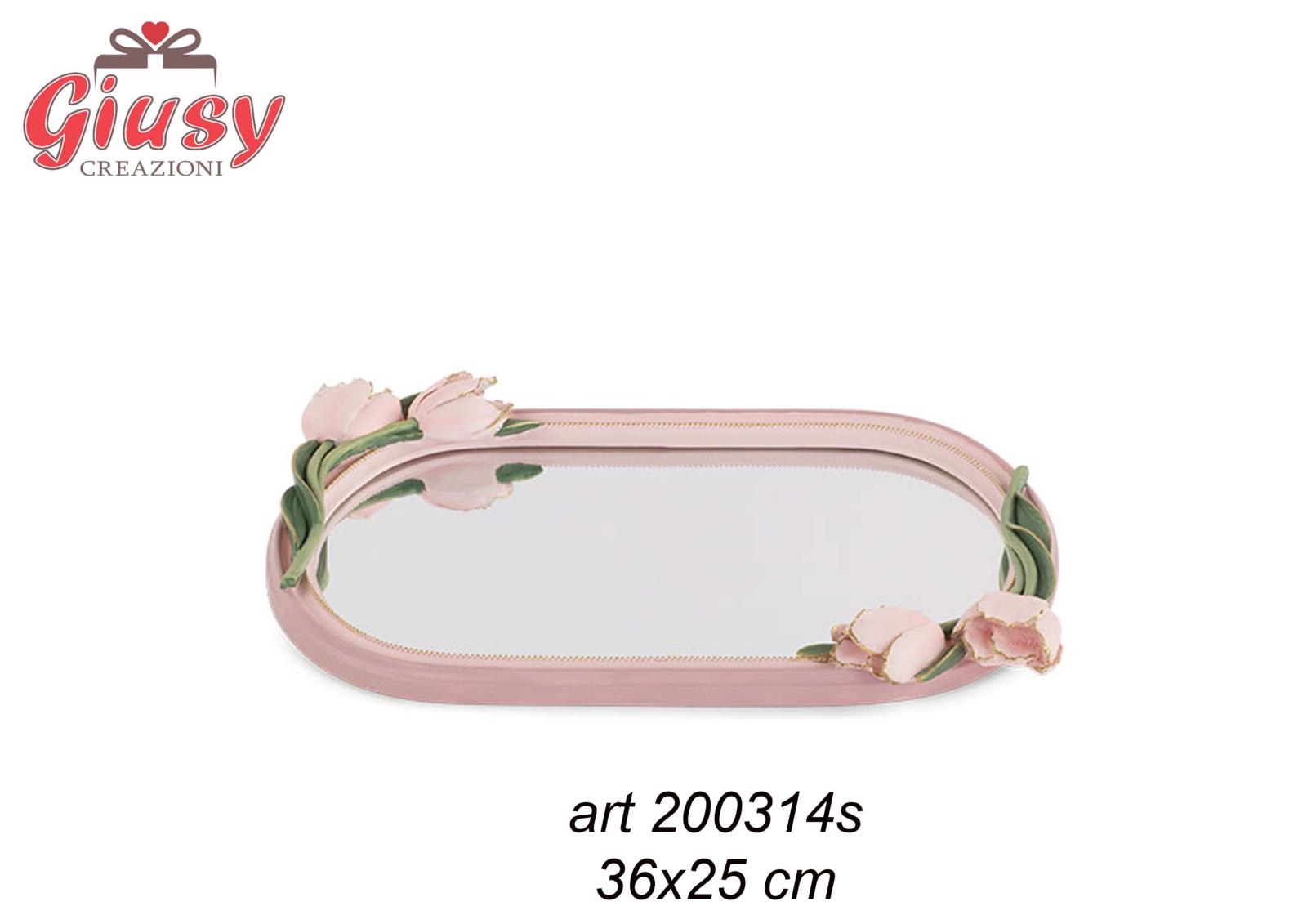 Vassoio Specchio Tulipano Rosa In Vetro E Poliresina 36X25 Cm 3*12