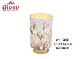 Lampada In Vetro Con Decoro Fiori d.10xH.14,5 Cm Completa Di Shopper 1*24
